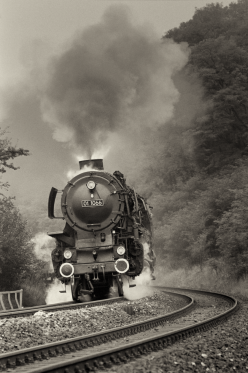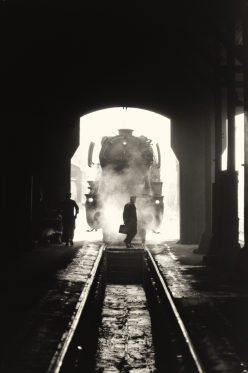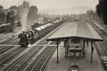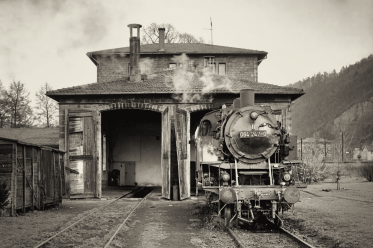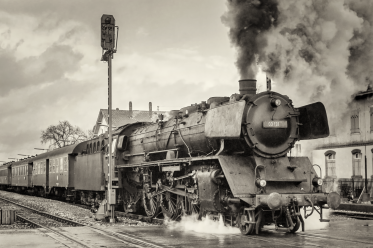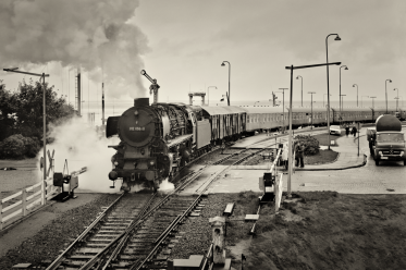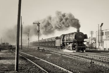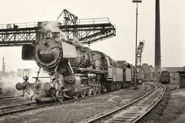 Auf der bei Eisenbahnfans berühmten Strecke Hof – Bamberg stampft 052 817-4 mit einem Güterzug bei eisiger Kälte Richtung »Schiefe Ebene«. 052 817-4 ist eine alte Stammlok des Bw Hof. Sie ist dort seit 1961 beheimatet. Das Summicron-R 2/50 mm-Objektiv an der Leicaflex SL steckt das harte Streiflicht mit stoischer Gelassenheit weg, so kann die ganze Faszination einer vorbeifahrenden, schwer arbeitenden Dampflokomotive hautnah erlebt werden.