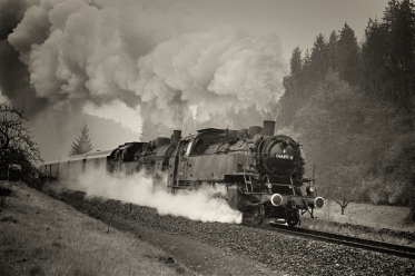 Vorspann auf dem Gäubahn-Abschnitt Rottweil – Horb an einem frühen Aprilmorgen bei Fischingen. Die feuchte Kühle der Nacht, es ist noch nicht 7 Uhr, sorgt für eine mächtige Dampfbildung – auch aus den Zylinderhähnen. 064 491-4 des Bw Crailsheim ist an das Bw Rottweil ausgeliehen und wird von dort aus als Arbeitszuglok bei den Elektrifizierungs-arbeiten der Strecke Böblingen – Horb eingesetzt. Im April 1974 läuft sie 14 Tage als Vorspannlok vor Nahschnell-verkehrszug N 3924. Sie befindet sich heute im Besitz des Vereins Dampfbahn Fränkische Schweiz e. V.