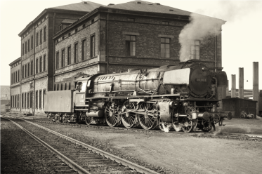 001 103-1 verlässt das Bw Hof Richtung Hauptbahnhof wegen einer Zugleistung nach Regensburg. Die mit ihrem Neubaukessel bullig wirkende Lok passt gut zu dem mächtigen Verwaltungsgebäude. In Spitzenzeiten hatte das Bw über 1000 Bedienstete. Die in den Himmel ragenden Betonpfeiler rechts im Bild erinnern an die schweren Kriegsbe-schädigungen: Am 8. April 1945 wurde das Bw von schweren Luftangriffen getroffen. Von den 140 dort beheimateten Maschinen waren nur noch 18 Loks einsatzfähig – weil sie zum Zeitpunkt des Angriffs unterwegs waren.