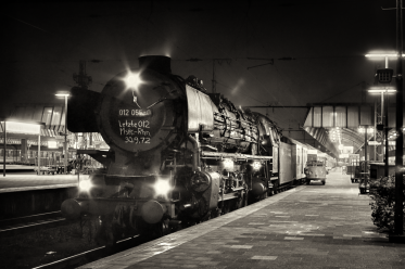 012 055-0 verlässt im Oktober 1973 mit einem Eilzug nach Köln den an der Nordsee, gelegenen Bahnhof Norddeich Mole, der einen direkten Übergang zu den Seefähren auf die Nordseeinseln ermöglicht. Kurz darauf, im November 1973 trifft die Ölkrise die ölgefeuerten 01.10. Lediglich die hier abgebildete 012 055-0 und die 012 075-8 teilen sich noch einen Mini-Umlaufplan. Die anderen acht 01.10 Öl werden abgestellt und durch effizientere Dieselloks der BR 216 vorübergehend ersetzt. Erst im Laufe des Januar 1974 werden die 01.10 schrittweise wieder in ihrem alten Umlaufplan eingesetzt.