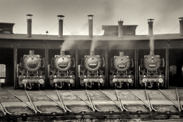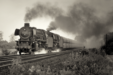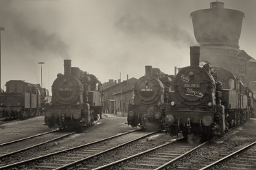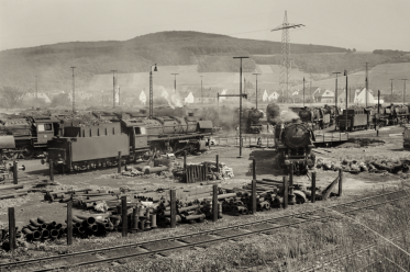 Die Außendrehscheibe des Bw Ehrang in der drückenden Wärme eines hochsommerlichen Nachmittags. Weniges reflektiert so eindrücklich die Behäbigkeit des damaligen Betriebs wie eine große Zahl von »Jumbos« der BR 44, die sich nach schwerer Fahrt »ausruhen«. Gleichzeitig ist die Szenerie voller Lebendigkeit, Geschäftigkeit: Die Loks »atmen«, zischen, brummen, rauchen. Lichtmaschinen surren, Pumpen schnarren, es wird Kohle nachgelegt, Wasser nachgeführt – schwerindustriell anmutendes Arbeitsumfeld im Kontrast zur Weinbergromantik der dahinter gelegenen Moselhänge.