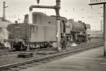 Koblenz gehörte Anfang der 1970er Jahre zu den besonders interessanten Zielen für Eisenbahnenthusiasten. Die dort zu beobachtende Baureihenvielfalt umfasste Loks der BR 01, 23, 44, 50, 82, 86, 94. Hier im Bild die Saarbrücker 023 069-8, die, aus Trier kommend, nicht das Bw ansteuert, sondern im Hbf Wasser fasst, um kurz darauf wieder – Tender voraus – einen Nahschnellverkehrszug nach Cochem zu fahren. Nicht mehr in Erinnerung ist, was der Heizer an diesem heißen Sommertag mit den Cola-Flaschen am Fuße des Wasserkrans machte …