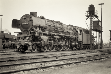 082 035-7 ergänzt die Betriebsvorräte in der Außenstelle Siershahn für den nächsten Einsatz. Während des Wasser-fassens inspiziert der Lokführer Triebwerk und Bremsen. 082 040-7 ist seit 1966 in Koblenz beheimatet. Mit ihrer Gegendruckbremse ist sie für den Einsatz auf den Steilstrecken Linz – Kalenborn und Boppard – Buchholz gerüstet. Maschinen dieser Nachkriegsbaureihe waren seit 1951 im Westerwald zuhause. Mit 082 035-7 wurde am 1. Mai 1972 die letzte Maschine dieser Reihe außer Betrieb genommen.