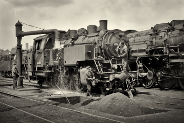 Dampflokunterhaltung ist eine arbeitsaufwendige Sache - gleich drei Bahnbedienstete kümmern sich: Nachdem die Lok bereits entschlackt und neu bekohlt ist, werden die Wasser- und Schmierölvorräte ergänzt, mit Hammerschlägen die Knebel der Rauchkammertür gelöst, die dort angesammelte Asche in die Grube im Vordergrund geschaufelt - „Lösche ziehen“. Von insgesamt 34 Heilbronner 64ern werden 27 Loks hier ausgemustert, die letzten werden am 01.06.1973 nach Crailsheim abgegeben. Im ehemaligen Bw ist heute das Süddeutsche Eisenbahnmuseum Heibronn untergebracht.