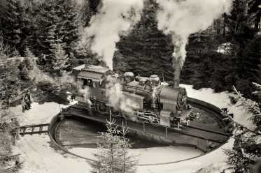94 1184 (pr. T 16.1) des Bw Lehrte, Einsatz-Bw Goslar, hat mit einem Sonderzug den Bahnhof Altenau im Harz erreicht und wird auf der dortigen kurzen Drehscheibe gewendet. Man beachte links neben der Drehscheibe den Vater mit seinen drei aufmerksamen Kindern, die das seltsame Geschehen interessiert verfolgen. 94 1184 wird am 10. September 1974 abgestellt. Die Maschine wurde zunächst von den Eisenbahnfreunden Kochertal erworben, dann aber weiter veräußert und befindet sich heute in zerlegtem Zustand bei der Rennsteigbahn in Ilmenau, Thüringen.