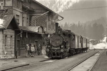 Wenn auch der Erztransport auf der Erzbergbahn im Vordergrund stand, so gab es auch 1975 noch zwei Personenzug-paare zwischen Vordernberg und Eisenerz. Ein Teil der Reisenden startete von der auf 1204 m Höhe liegenden – wenig mondänen – Passtation Präbichl zu Touren auf den Reichenstein (2166 m) und Polster (1911 m), die seit 1948 über Sessellifte erreichbar waren. 97.217, Baujahr 1908, hat den Zug auf die Passhöhe geschoben und soeben auf die andere Seite des Zuges umgesetzt, um den Zug, talseitig bremsend, sicher über die Gefällstrecke nach Eisenerz zu führen.