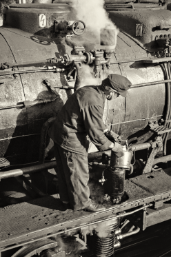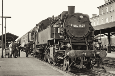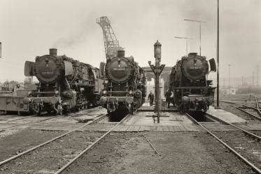 Die Dampfzeit war personalintensiv. In wechselnden Dienstplänen wurde hart gearbeitet, es gab aber auch immer wieder betriebsbedingte Arbeitsunterbrechungen, die Gelegenheit zu entspannt-heiteren Gesprächsrunden boten, wie die hier neben der Lok stehende Eisenbahnergruppe in Erinnerung ruft. Der Umgang war nicht zuletzt deswegen ein anderer, weil Lokführer und Heizer immer als Team arbeiteten. Den Sorgen älterer Lokführer gegenüber dem Traktionswechsel begegnete die DB teilweise damit, dass für eine Übergangszeit auch auf Diesel oder E-Loks ein zweiter Mann mitfuhr.