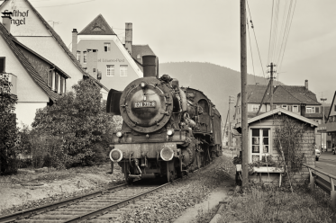 Zu dieser Aufnahmesituation sei ein Zitat von Herbert Vaupel aus »Dampfgeführte Reisezüge, 1973« erlaubt: »Gegen 15 Uhr erzittern die Kuckucksuhren in den vielen Souvenirgeschäften, wenn die preußische Straßenbahn durch die Geschäftsstraße Alpirsbachs poltert«. Im Gasthof »Engel« und im Hotel »Löwen Post« (links im Bild) wird sicher das bekannte »Alpirsbacher Klosterbräu« ausgeschenkt. Im weiteren Fahrtverlauf verlässt der Zug bei Schiltach die »Königlich Württembergische Eisenbahn« und erreicht die Gleise der ehemaligen »Badischen Staatsbahn«.
