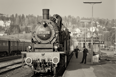 78 246 (pr. T 18) hat sich in Freudenstadt frühzeitig vor den Eilzug E 1947 nach Eutingen gesetzt, der Freudenstadt fahrplanmäßig in genau elf Minuten, um 7.21 Uhr verlassen soll. Zwei Schlosser sind aus der Werkstatt des nahen Bahnbetriebswerks (rechts im Hintergrund) herbeigeeilt und bemühen sich um die Lichtmaschine. Ob das Problem behoben werden konnte, wissen wir nicht. Jedenfalls verließ der Zug den Freudenstadter Hauptbahnhof pünktlich auf die Minute.