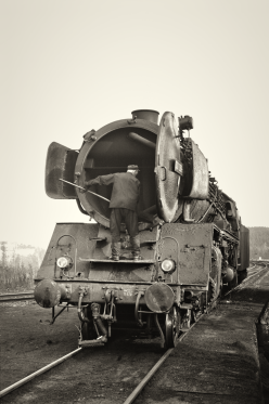 082 035-7 ergänzt die Betriebsvorräte in der Außenstelle Siershahn für den nächsten Einsatz. Während des Wasser-fassens inspiziert der Lokführer Triebwerk und Bremsen. 082 040-7 ist seit 1966 in Koblenz beheimatet. Mit ihrer Gegendruckbremse ist sie für den Einsatz auf den Steilstrecken Linz – Kalenborn und Boppard – Buchholz gerüstet. Maschinen dieser Nachkriegsbaureihe waren seit 1951 im Westerwald zuhause. Mit 082 035-7 wurde am 1. Mai 1972 die letzte Maschine dieser Reihe außer Betrieb genommen.