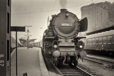 001 088-4 verlässt Hof Hbf mit dem D-Zug D 854 nach Bamberg, während 001 173-4 auf dem Nachbargleis bereits die Waggons des Eilzugs E 852 vorheizt, der eine Stunde später in die gleiche Richtung fahren wird. Das Foto der zwei 01 mit Altbaukesseln erinnert daran, dass nicht wenige sagten, dass diese für die Hofer Einsatzbedingungen besser geeignet waren, als die Loks der BR 01, die ab 1957 einen Hochleistungskessel erhalten hatten. Die letzten in Hof eingesetzten Loks 001 008-2, 001 111-4, 001 150-2 und 001 173-4 hatten ausnahmslos Altbaukessel.